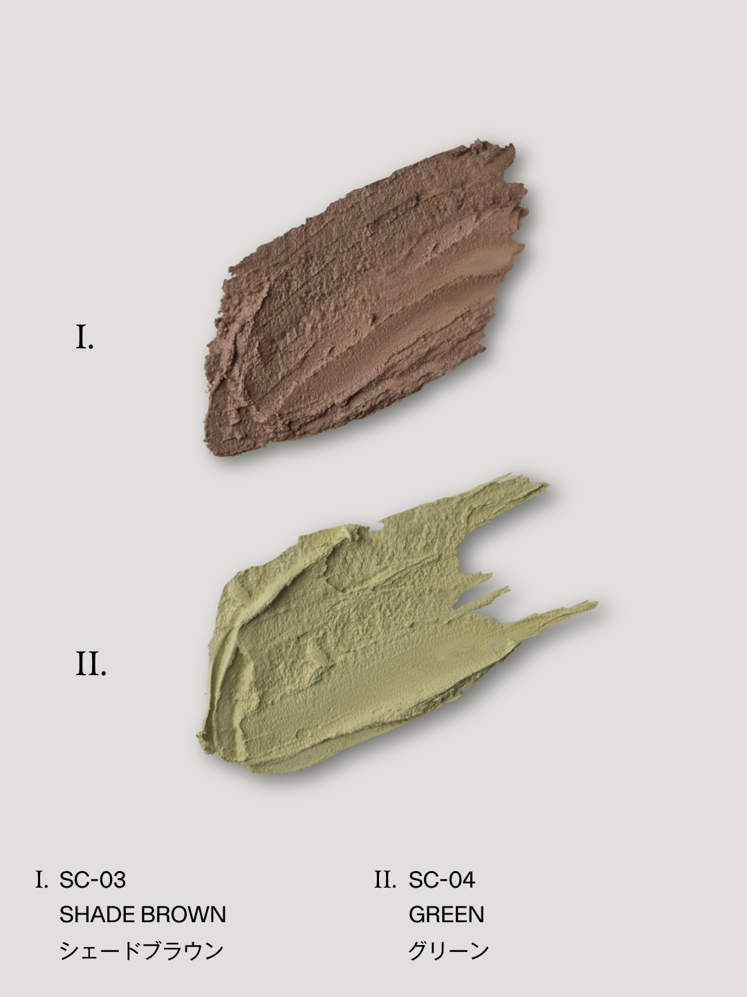 シェードブラウン(SC-04)をフェイスラインやこめかみなど、影を添えたい部分にシェードグリーンを軽くのせる